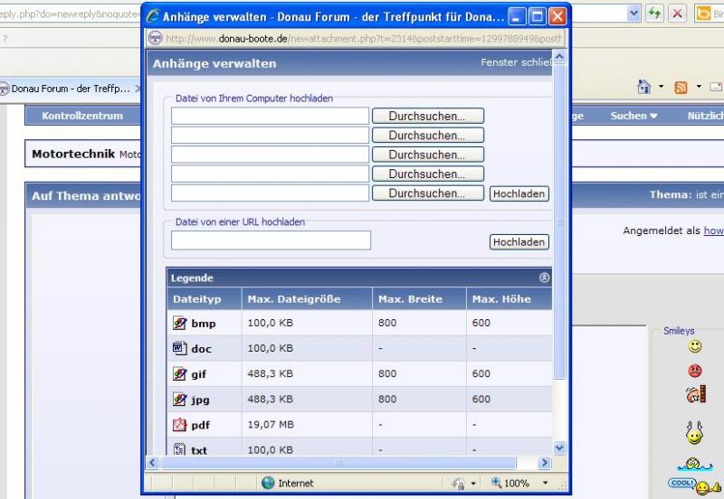 Du kannst jedem Beitrag bis zu 5 Bilder anhängen, ohne dafür Fotos, die dann eh nicht mehr gebraucht werden, in einem Album zu hinterlegen... Du klickst bei "auf Thema Antworten" auf die Büroklammer oben... Anhang 11978 Dann öffnet sich das folgende Fenster, dort kannst die Bilder einzeln auswählen... Anhang 11979 |