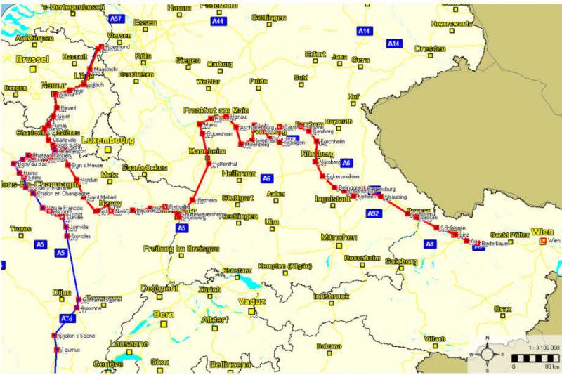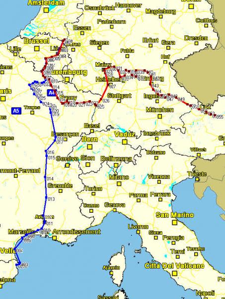 Die blaue Linie zeigt die Strecke, die wir im vergangenen Jahr gefahren sind , von Ampuriabrava nach Roermond und die Rote, die Strecke die wir in diesem thread, bzw. auch im Teil 1 beschrieben haben :