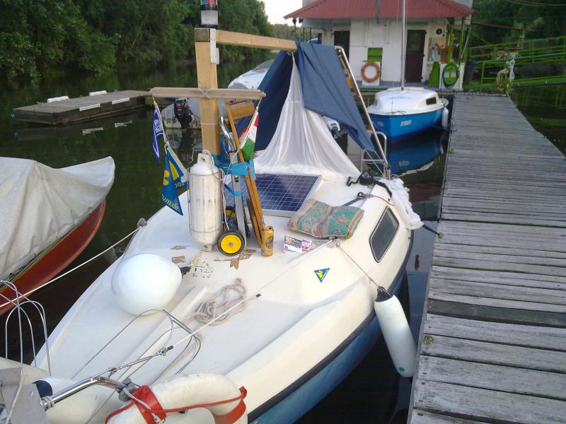 Die Viecher können mich mal und ich streck ihnen jedes mal aus meiner Trutzburg die Zunge raus. ![]() ![]() Es hat sich als gut herausgestellt Visitenkarten machen zu lassen. Im Harosi Yacht Club machte ich einfach an einem frein Platz fest. Irgendwann kamm der Besitzer des Platzes. Bis dahin hatte ich die Platzfrage geklärt und konnte einfach verlegen. Auf die übliche .Frage woher und wohin wie immer Daumen hoch und "schöne Reise". ![]() Da gab ich ihm eine Karte und sagte daß er später die Bilder auf der Homepage findet. Eine halbe Stunde später ruft jemand "Wolf!". Ich schaue und da steht Imre mit Benzinkanistern in der Hand und frägt ob ich in den Supermarkt möchte. ![]() Ich kenne den Fußweg vom letzten mal und sagte sehr gerne "Ja". Dann machte er noch eine halbe Stunde Rundfahrt durch Èrd, seinem Wohnort mit mir. Dort gibt es z.B. eines von 4 Minaretts in Ungarn. Das stammt noch aus den Zeiten des Osmanischen Reiches und auch ein türkisches Badehaus ist erhalten. Die Bilder davon kann ich hier aber nicht hochladen da zu groß. Das Minarett hab ich mal verkleinert. Meine zaghaften ungarisch Versuche werden übrigens sehr wohlwollend aufgenommen. ![]()