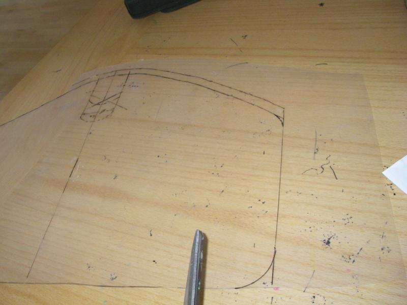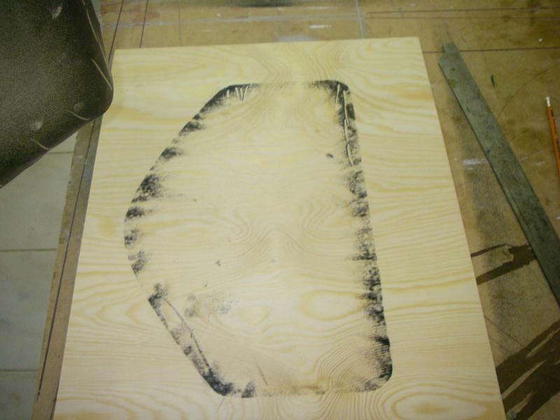 ![]() Als erstes die Kontur vom Bug abgezeichnet und auf Folie direkt am Boot übertragen, dann Folie ausschneiden. Die Folie mim Haarspray auf Sperrholz fixieren und mit Kontrollschwarz die Konturen übertragen. |