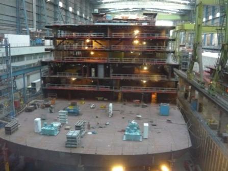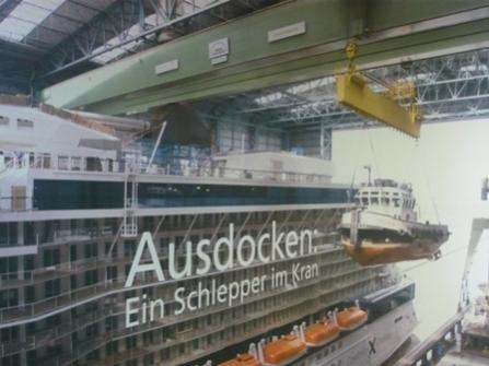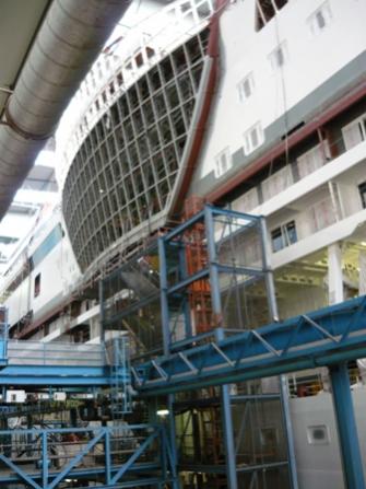 Schiffe werden dort gerade 3 Stück gebaut: AIDAmar 71.100 BRZ, Celebrity Refection 122.000 BRZ und die Disney Fantasy 130.000 BRZ, wir waren in beiden Baudocks Halle 1: 370m x 102 m x 60m Bau der AIDAmar. Halle 2: 504 m x 125 m x 75 m Bau der Disney Fantasy und Baubeginn der Celebrity Refection.