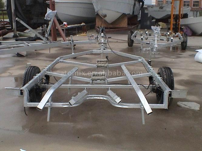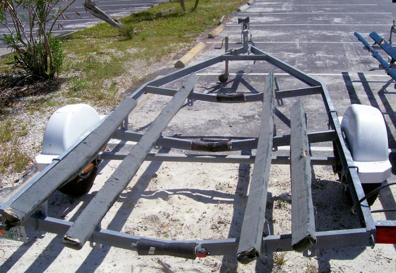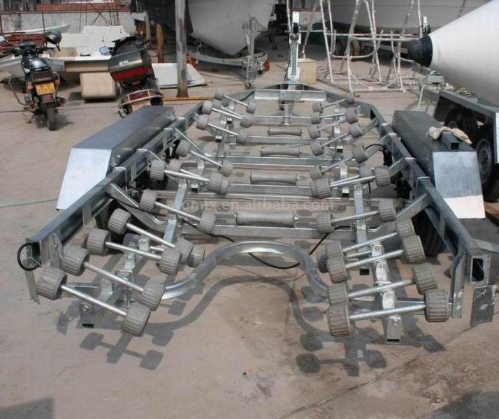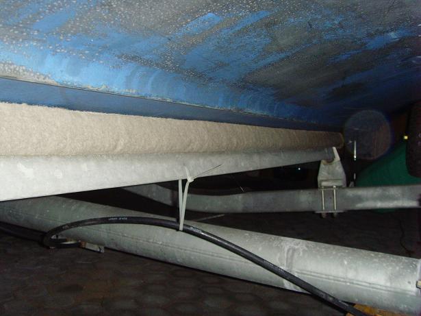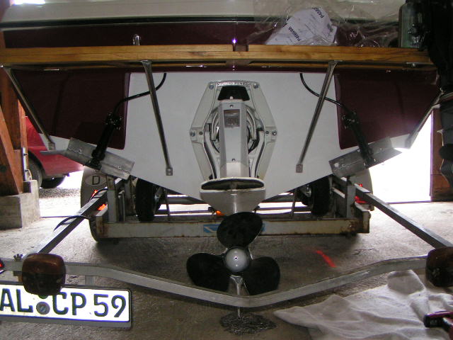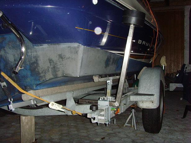 Die seitliche Kurbelstütze habe ich drangeschraubt, damit ich das Boot beim Kranen das Boot von den Langauflagen hochkurbeln kann, damit das Band vom Kran raus kann, wenn es eingeklemmt ist. Man sieht, du kannst einfach drauffahren, (mußt eben durch die beiden Rollen treffen, dann an die Kielstütze und Winde vor, gut) Übrigens: Eckaat (Gott hab Ihn selig) hat dazu sogar ein Video gedreht. Er macht es sogar mit Rollen !. |